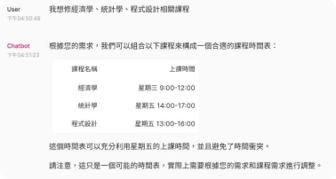 將每學期的選課作業改為問答方式進行,應用「課程爬蟲」獲得之課程資料,篩選有用的資訊,再進行相似度搜尋。使用者可透過提問或指令方式進行選課作業,屆時語言模型將依課程時間、上課內容及課程評價,自動推薦並生成課表。